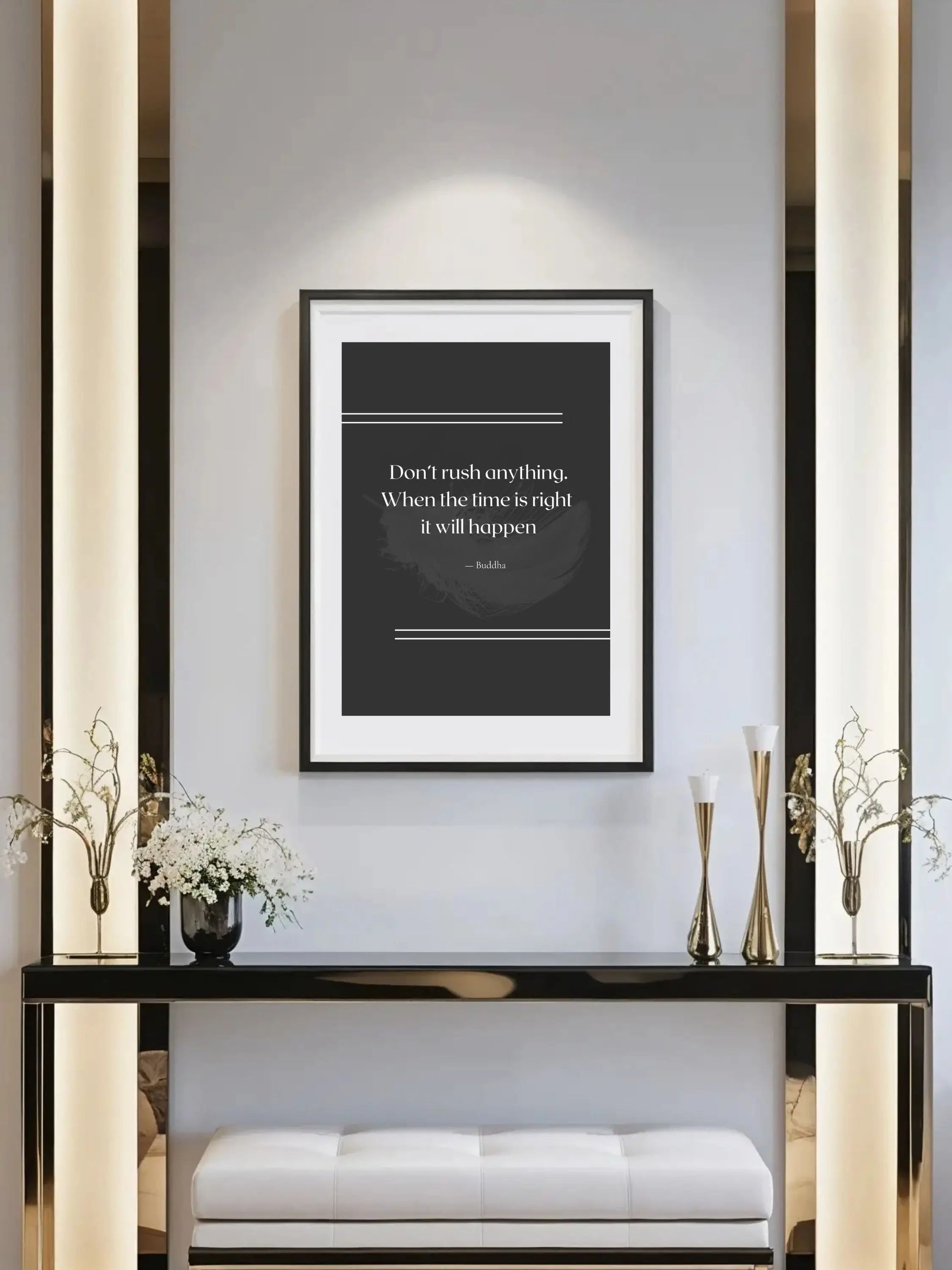 Infuse your space with timeless wisdom and embrace the power of patience with this serene Buddha quote print: “Don’t rush anything. When the time is right, it will happen.”