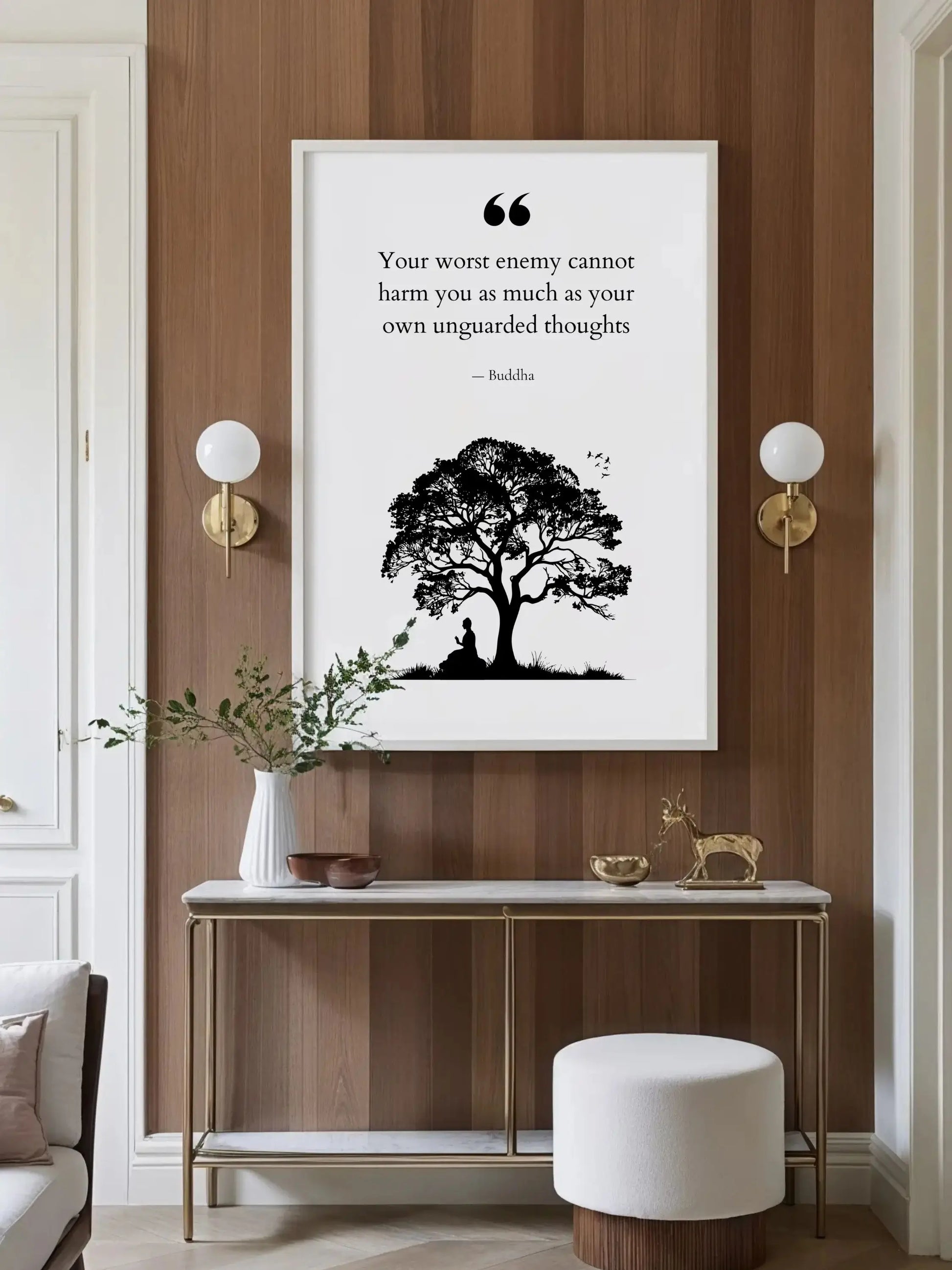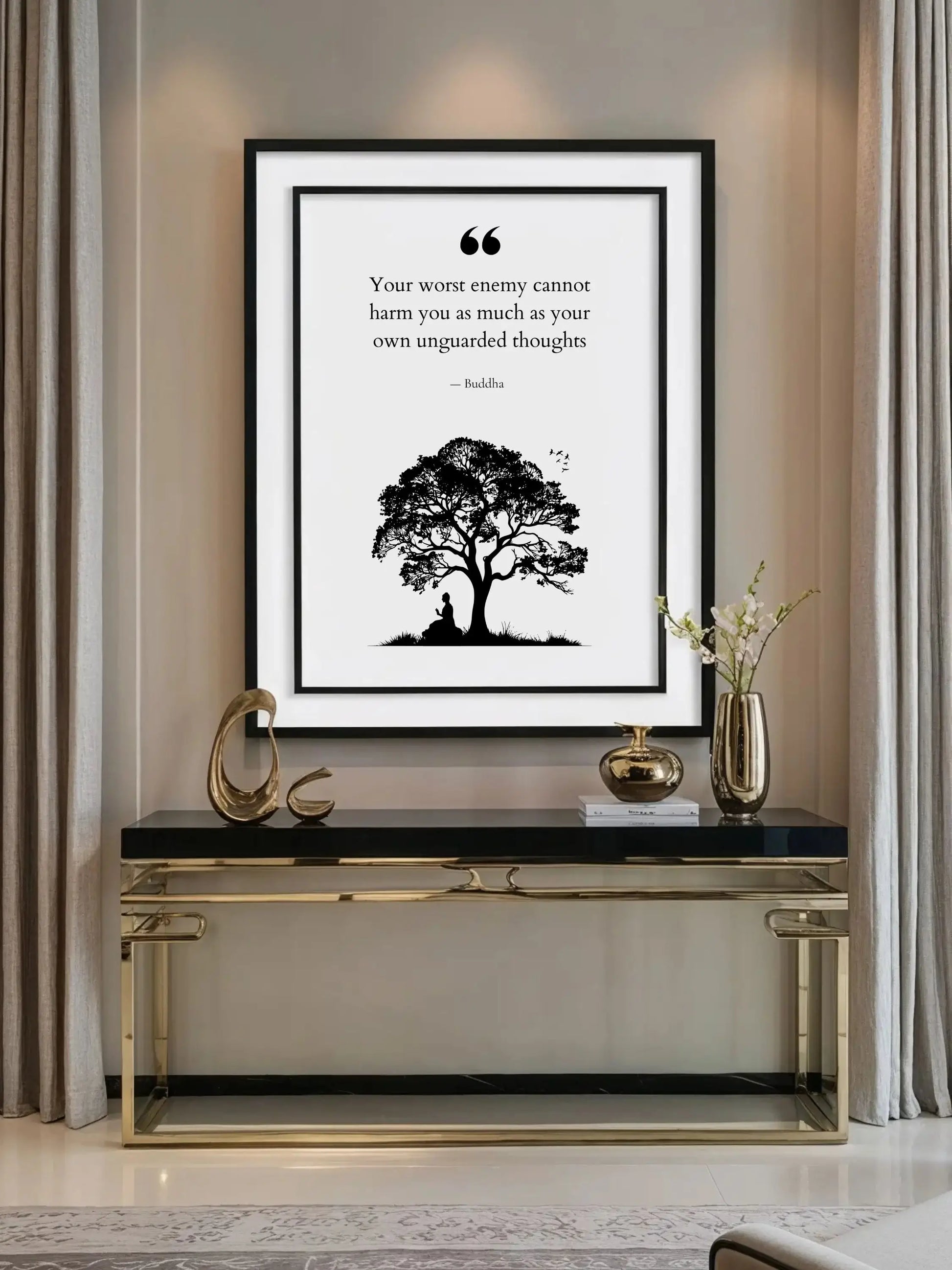 The minimalist design, paired with high-end luxury materials, complements both modern and traditional interiors, allowing the words to resonate in a space designed for relaxation and spiritual growth. Printed on museum-quality matte paper, the soft monochrome tones capture the essence of Buddha's timeless wisdom, blending seamlessly into your environment, whether in a home or office setting.