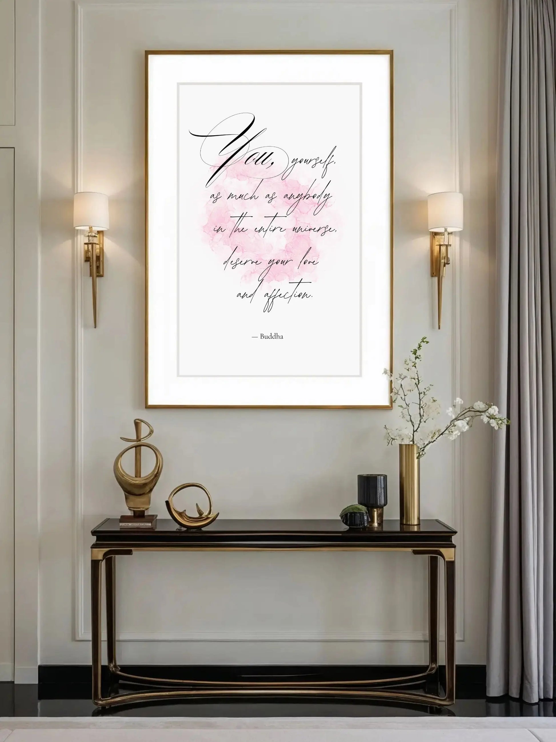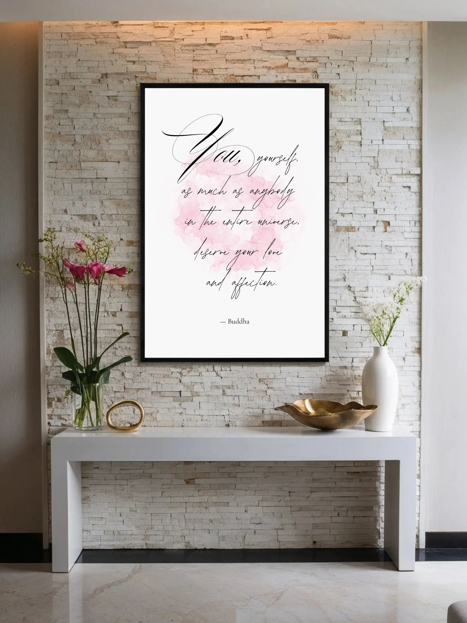 Elevate your space into a sanctuary of serenity and self-love with this empowering Buddha quote print. As you walk into your living room, bedroom, or meditation space, let the soft presence of this beautiful art piece greet you with a gentle reminder: “You, yourself, as much as anybody in the entire universe, deserve your love and affection.” These timeless words from Buddha offer more than inspiration—they invite you to pause, breathe, and reconnect with your inner peace.