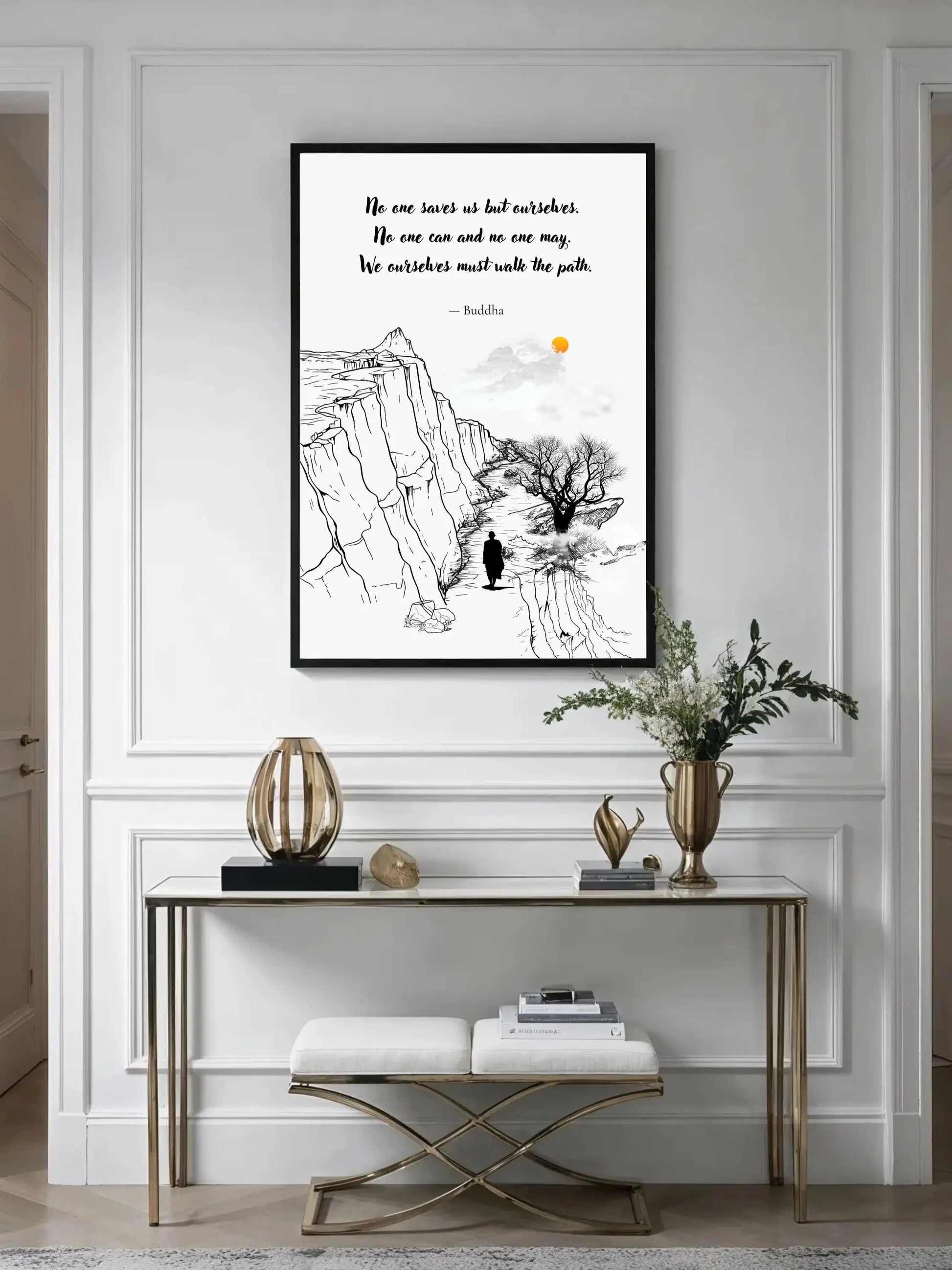 Embrace the power of self-reliance and spiritual growth with this powerful Buddha quote print: “No one saves us but ourselves. No one can and no one may. We ourselves must walk the path.”