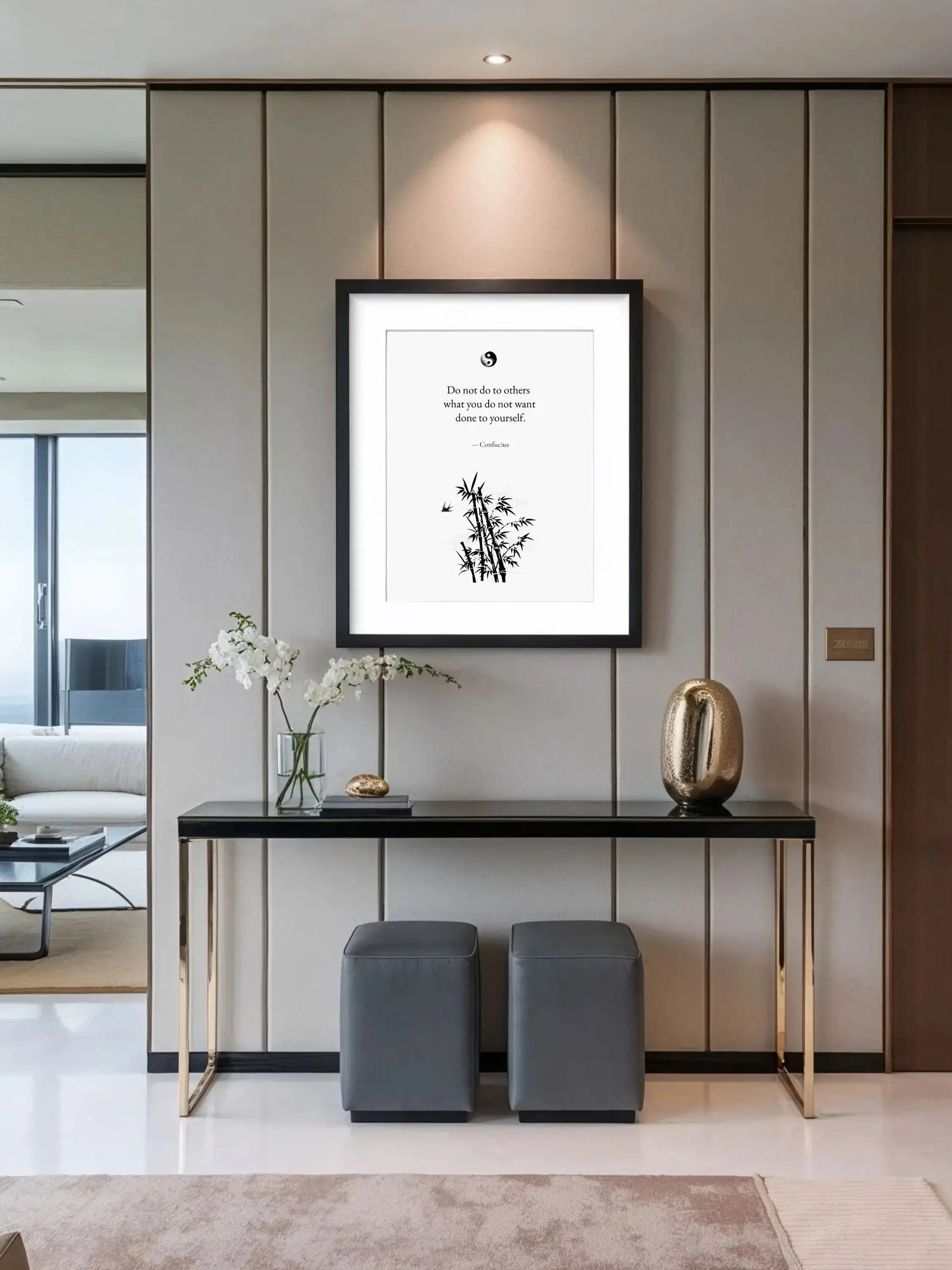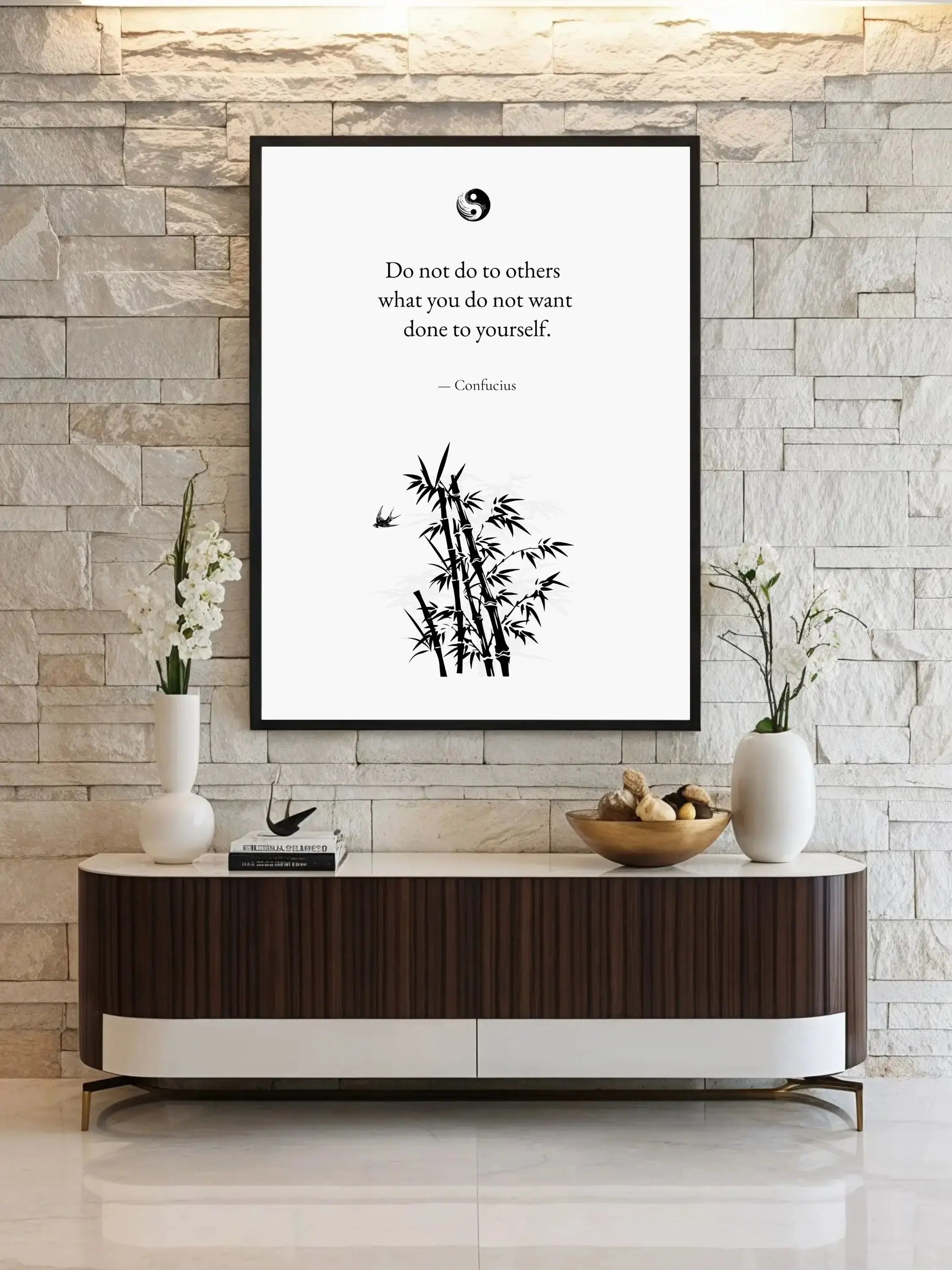 Transform your space with the timeless wisdom of Confucius, beautifully captured in this high-end quote print. Featuring the profound saying, “Do not do to others what you do not want done to yourself,” this piece serves as a constant reminder of empathy, respect, and mindful living. The serene bamboo trees and a single bird in flight nearby reflect the quiet strength of nature and the gentle flow of life, evoking peace and balance.