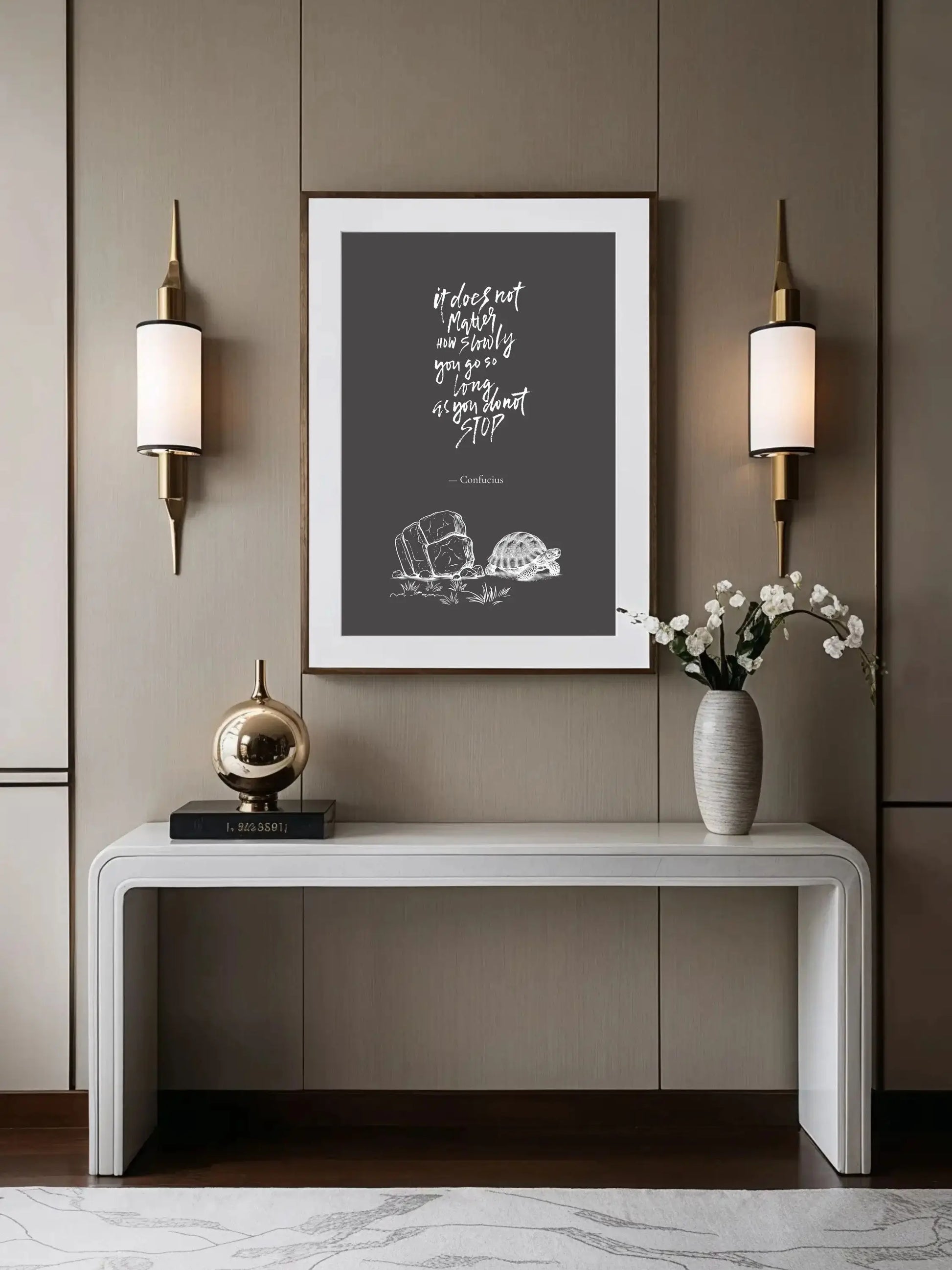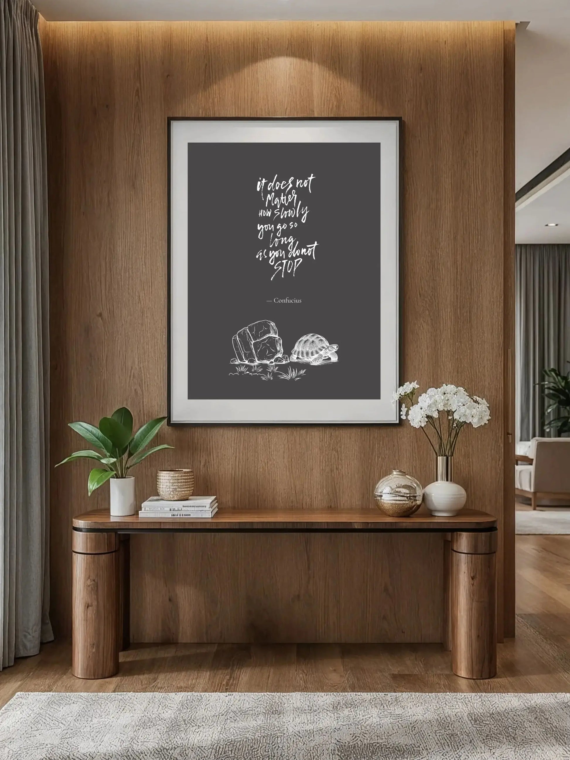 Embrace timeless wisdom with the Confucius Quote Print, featuring the profound words, “It does not matter how slow you go, so long as you do not stop.” It's a reflection of the quiet strength within us all—reminding us that patience and persistence lead to meaningful growth. The art featuring a tortoise moving slowly forward, leaving a rocky path behind, symbolizes the power of perseverance. Like each deliberate step of the tortoise, even the slowest progress is part of an unstoppable journey.
