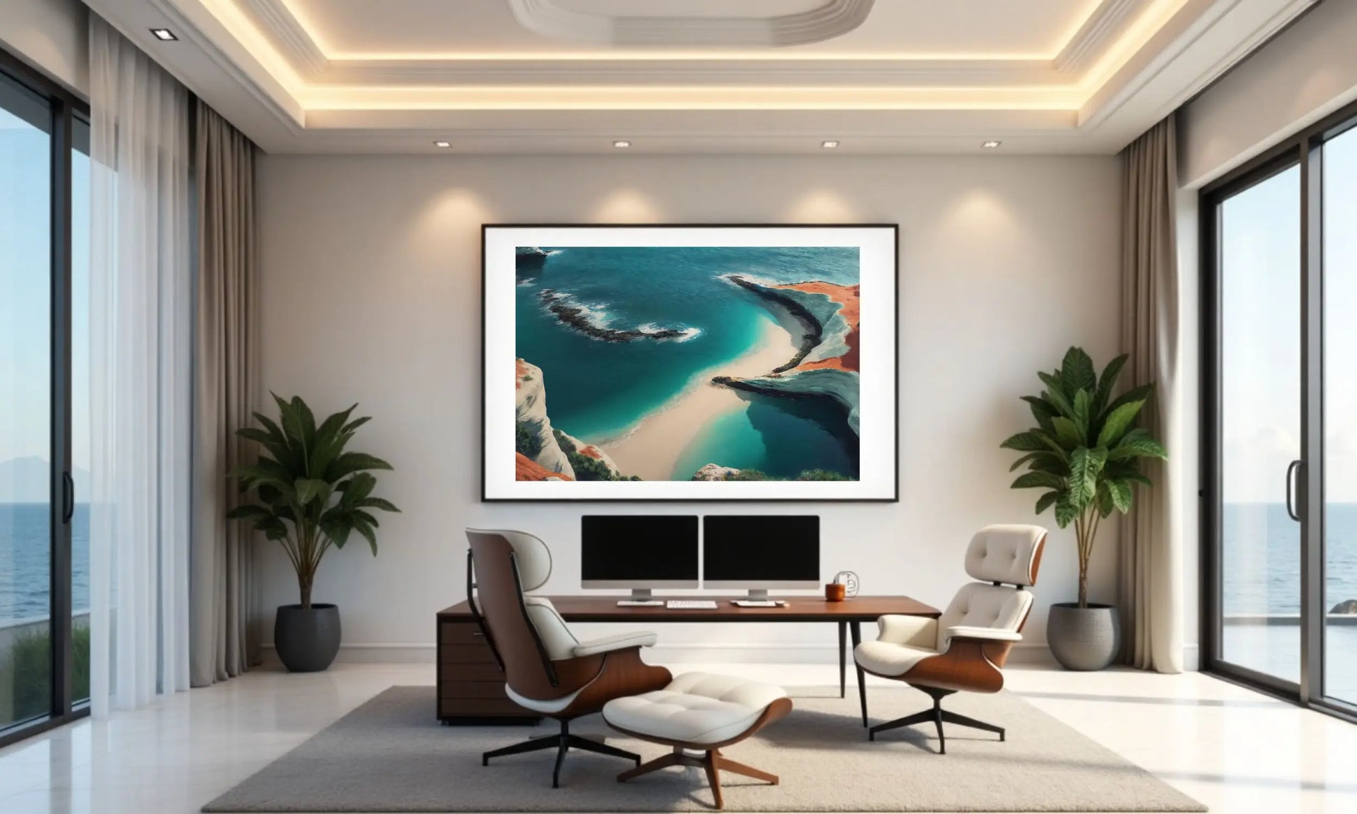Echoes of the Soul is not just a piece of wall art, it’s a visual meditation – a spiritual escape into the serene beauty of coastal landscapes. Turquoise tides kiss the sand while sculptural rocks rise like ancient memories. The sea folds gently in on itself, evoking a sense of calm and introspection.