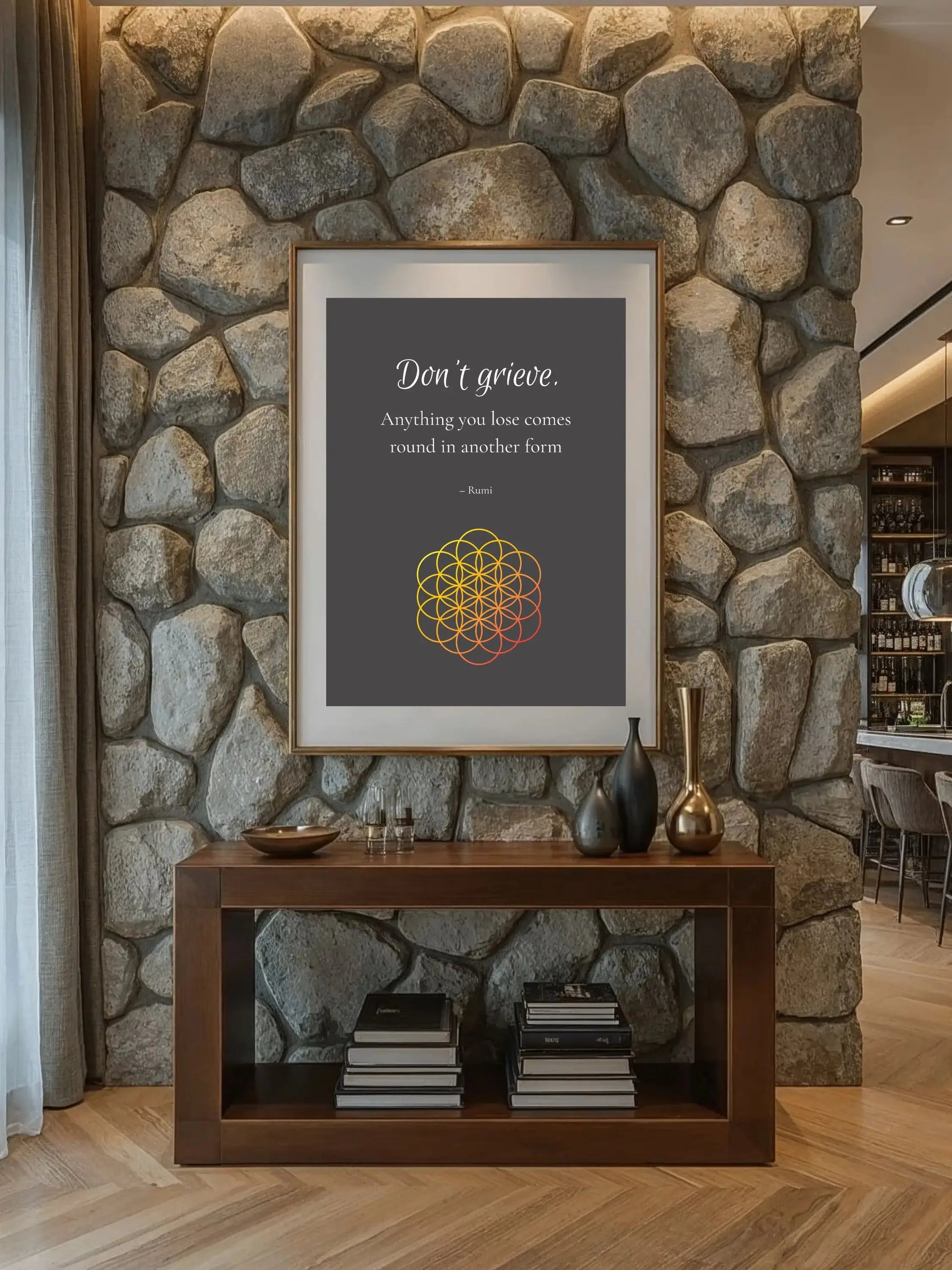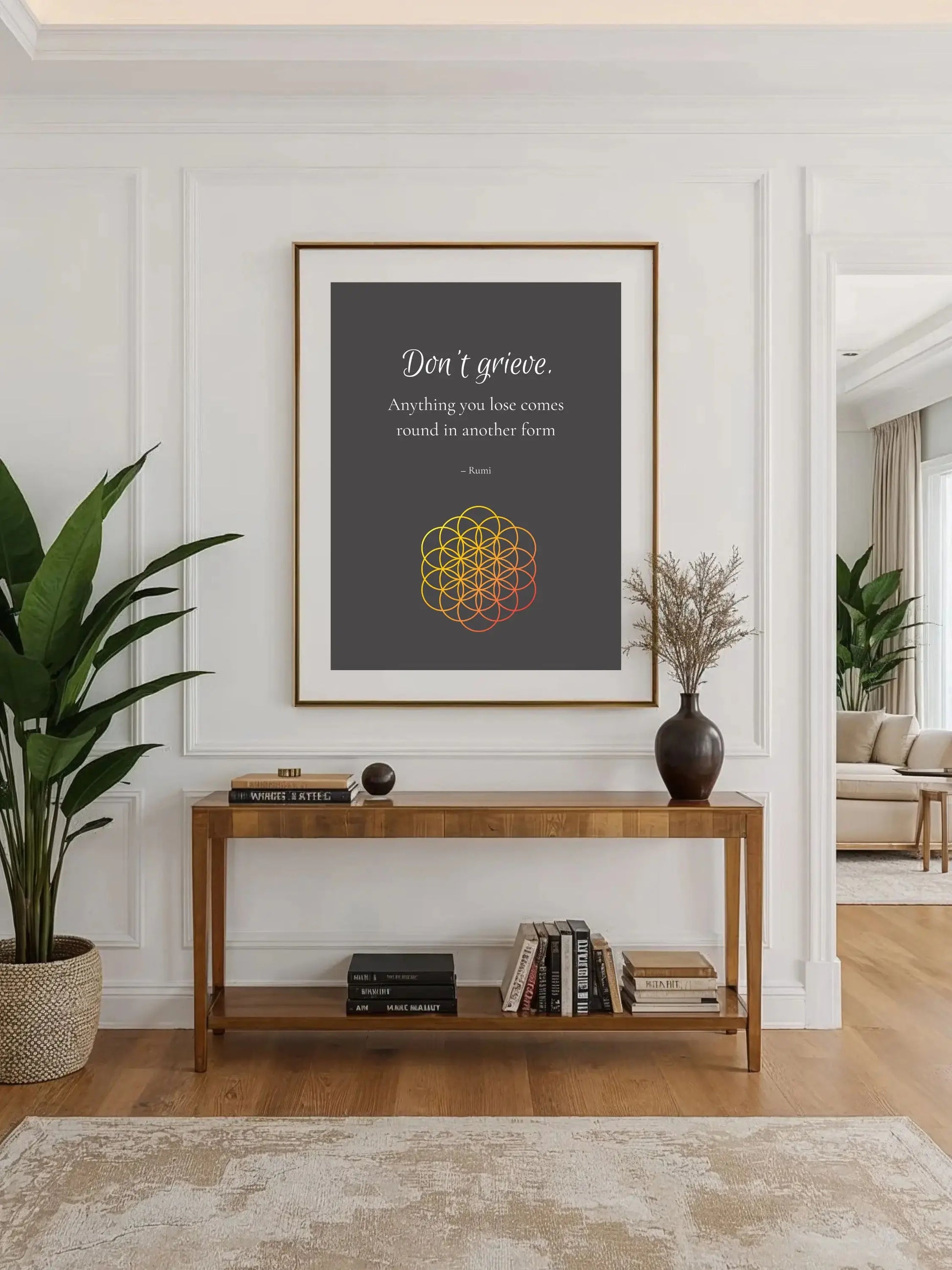 Transform your space with this exquisite Rumi quote print—an elegant piece of high-end spiritual wall art designed to inspire hope, renewal, and emotional resilience. Featuring Rumi’s timeless wisdom, “Don’t grieve. Anything you lose comes round in another form,” this print serves as a gentle reminder of life’s cyclical nature and the power of personal transformation.
