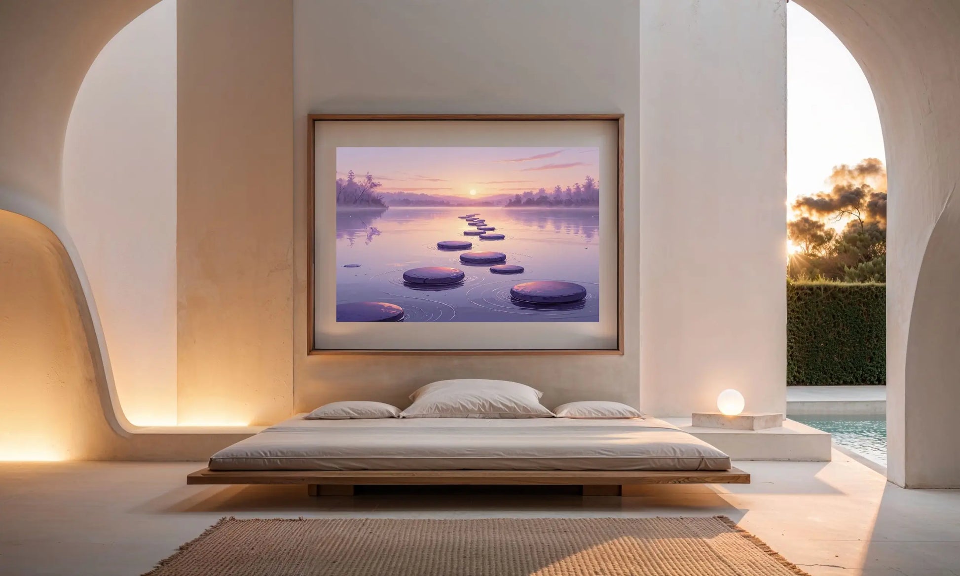Serenity Steps captures the gentle poetry of sunrise mirrored across tranquil water. A procession of sculptural stepping stones leads the eye toward a glowing horizon — a visual metaphor for presence, transition, and soul-deep calm.
