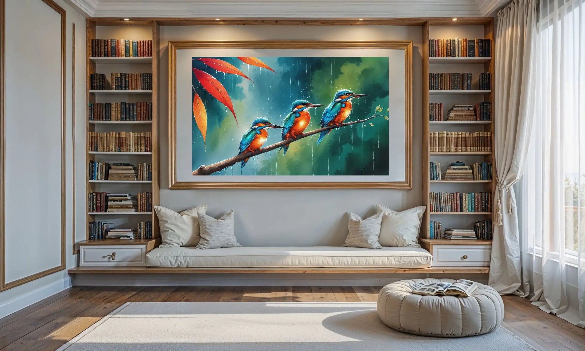 Transform your space into a sanctuary of mindful serenity with The Perch of Grace — a nature-inspired kingfisher wall art print that celebrates unity, resilience, and peaceful connection. This soulful piece captures a tranquil moment of kinship as three luminous kingfishers rest side by side, embodying strength, stillness, and the beauty of togetherness.