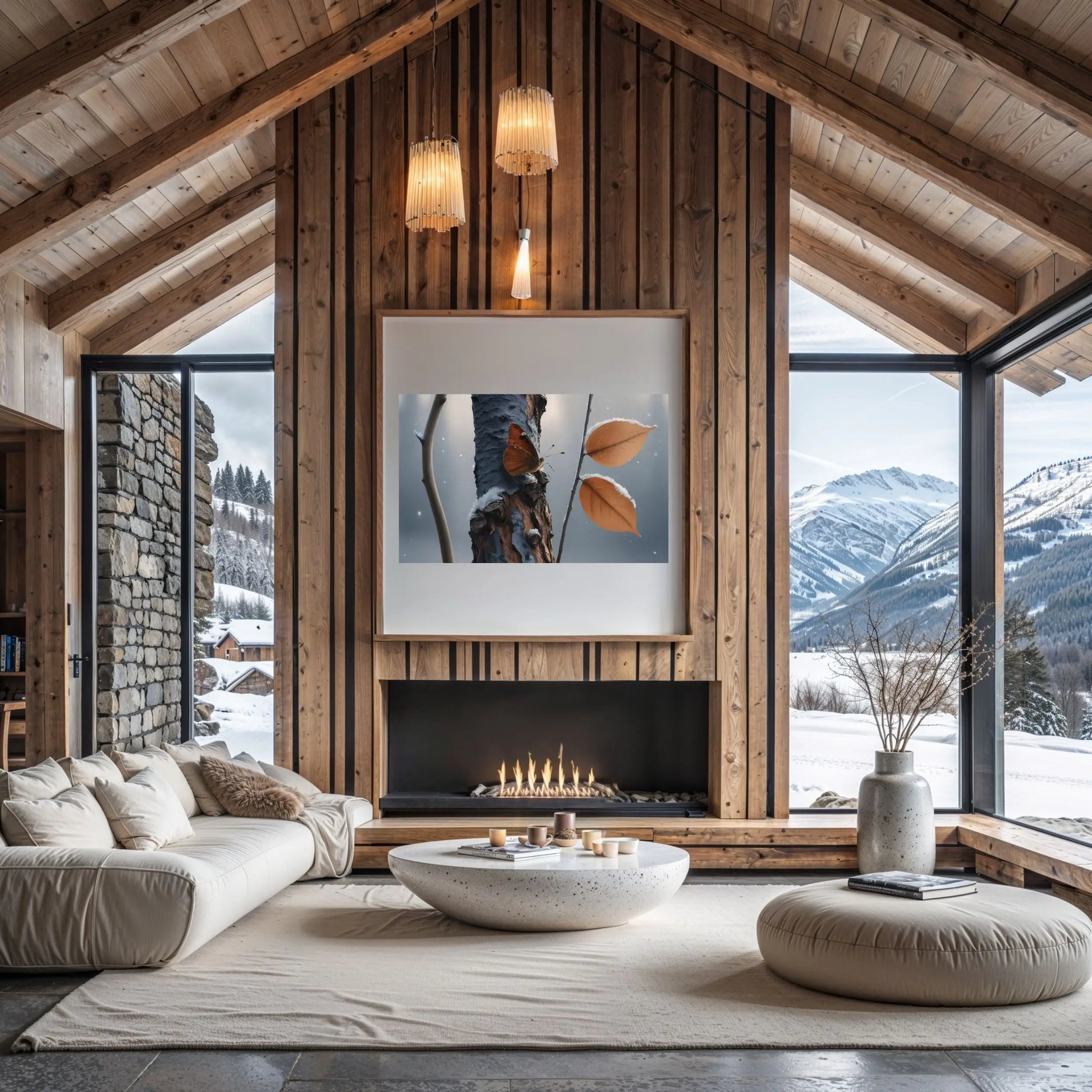 Here, amidst the winter woods, the silence becomes profound. Each element — from the amber leaves clinging to memory to the single butterfly, paused mid-flight — tells the story of hidden moments and quiet strength. This artwork is not just a decorative piece; it’s a visual poem, evoking a deeper connection to nature, solitude, and the silent magic that surrounds us.